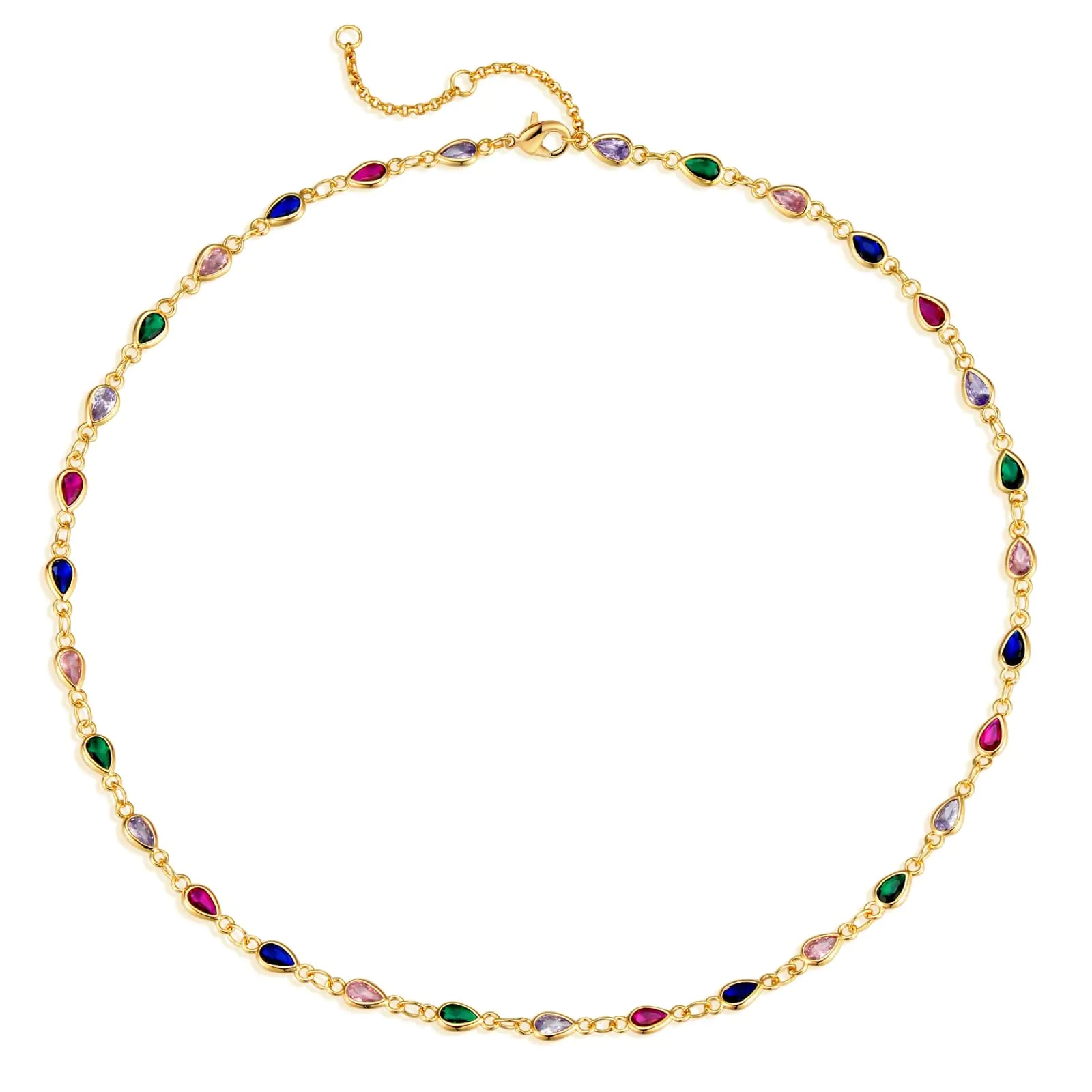 [Drop-Shaped Colored Zirconia Gold Choker: Each carefully selected for their brilliance and cut to perfection. Each drop-shaped stone sparkles with a dazzling intensity. Crafted with meticulous attention to detail the zirconia gemstones are expertly set in a high-quality gold setting ensuring both comfort and style. This necklace is not only a stunning addition to your own jewelry collection but also makes a perfect gift for birthdays anniversaries or any special occasion. Size: The size of the drop-shaped coloful cubic zirconia choker is 14.5" with 2" adjustable lengths. Droplets: 0.4"(H) 0.16"(W) 0.06"(H). Water drop spacing: 0.3". The combination of cheerful hues creates a harmonious and eye-catching display that will instantly uplift your mood. Fit for any occasion. 18k Gold Plating: 18K gold plated over high quality brass twice plated provides an extremely tough durable long lasting coating to ensure a long without faded. No nickel and no lead comfort and durability hypoallergenic which makes our necklace more Tarnish Resistant Sweat. Maintenance: Please remove before bathing or sleeping avoid prolonged exposure to sunlight avoid excessive humidity or high temperatures "Gift Packaged: Every jewelry packaged in a cute box. They are well-suited for any gift giving occasion and are perfect gifts for yourself or someone you love. Our jewelry makes a sentimental surprise and a great gift for birthdays anniversaries Mothers Day or wedding celebration. My own jewelry-GDCOIN."]