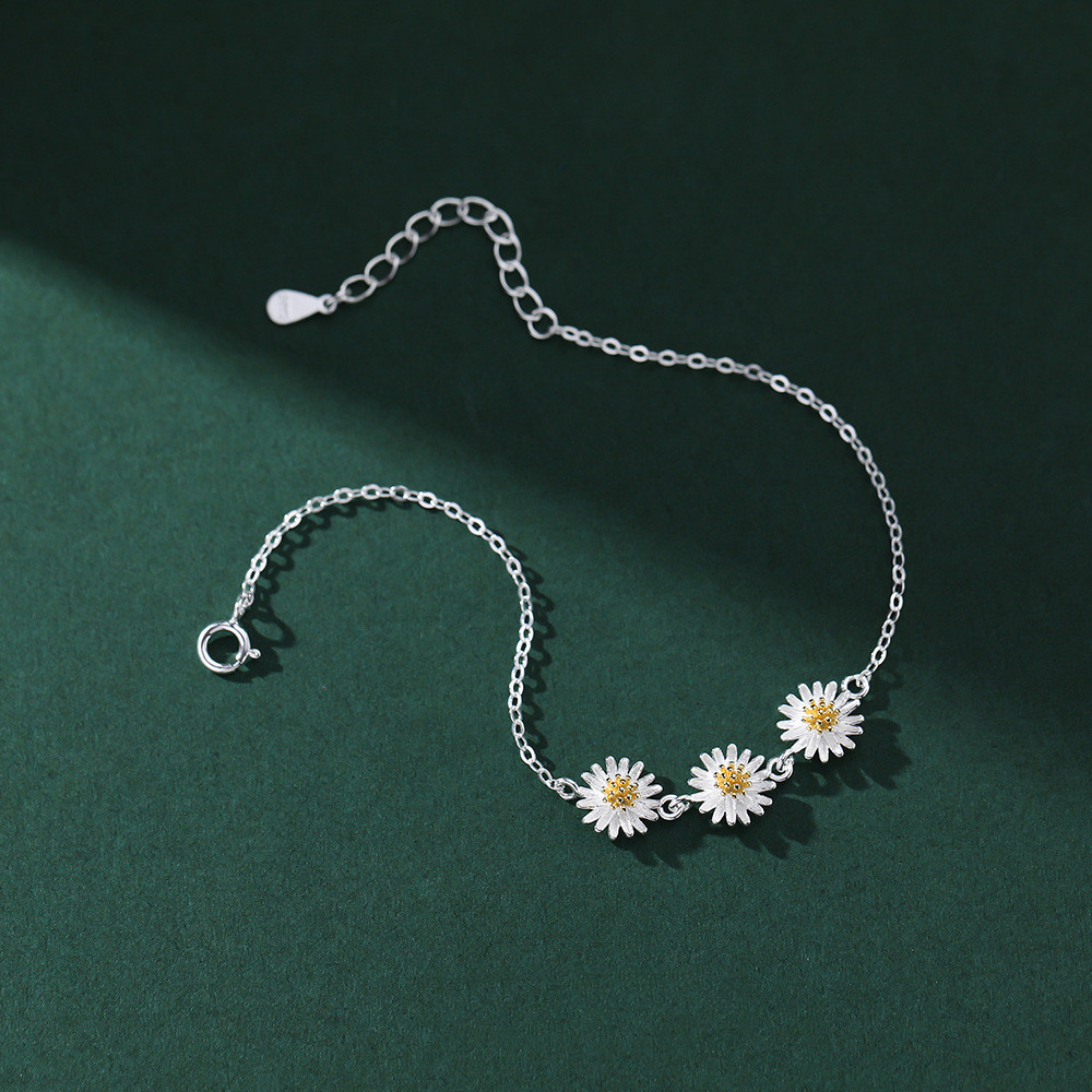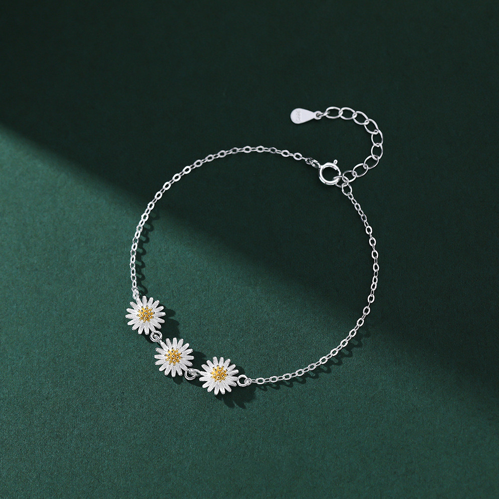 The bracelet features a unique geometric shape adorned with a charming small daisy, adding a touch of playfulness to its elegant simplicity. With a size of 8x8mm and an adjustable chain length of 16+3cm, it ensures a perfect fit for every wrist.