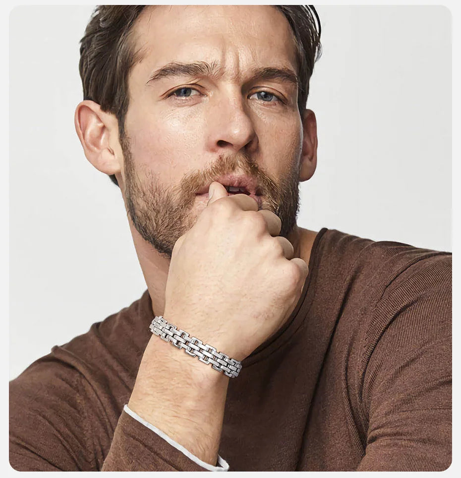 Vnox 11mm Watchband Shaped Chain Bracelet for Men Teens Boys,Strap Chain Bracelets, Black Silver Color Stainless Steel Wristband